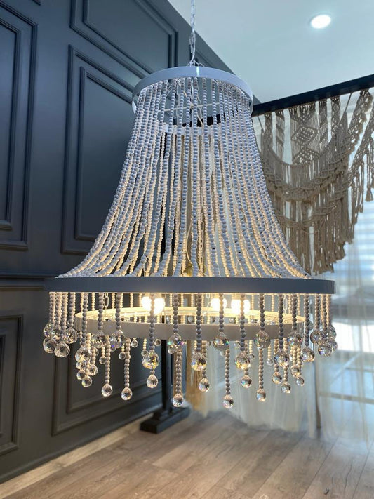 Boho Nursery Chandelier – White Wooden Beads and Crystal Drops for Girls Bedroom or Baby Room - Modern Living Room Lighting