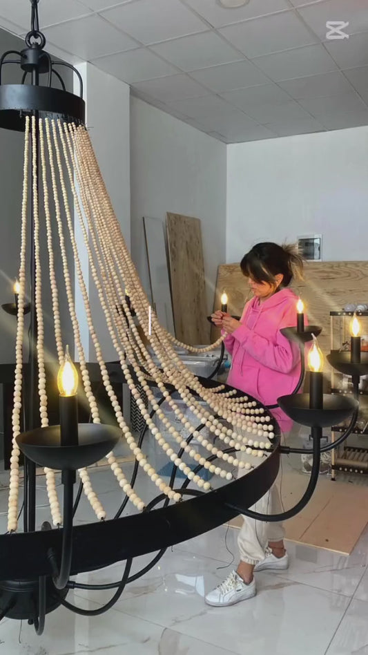 "Adorned with soft pink wooden beads, this handmade chandelier combines natural beauty and elegance, casting an enchanting glow that captures attention in any setting."